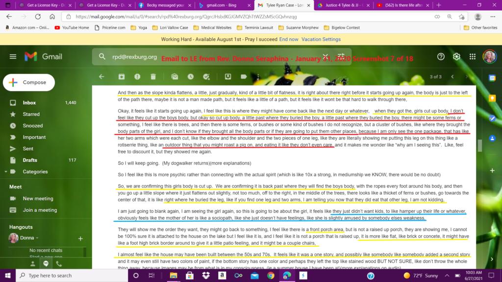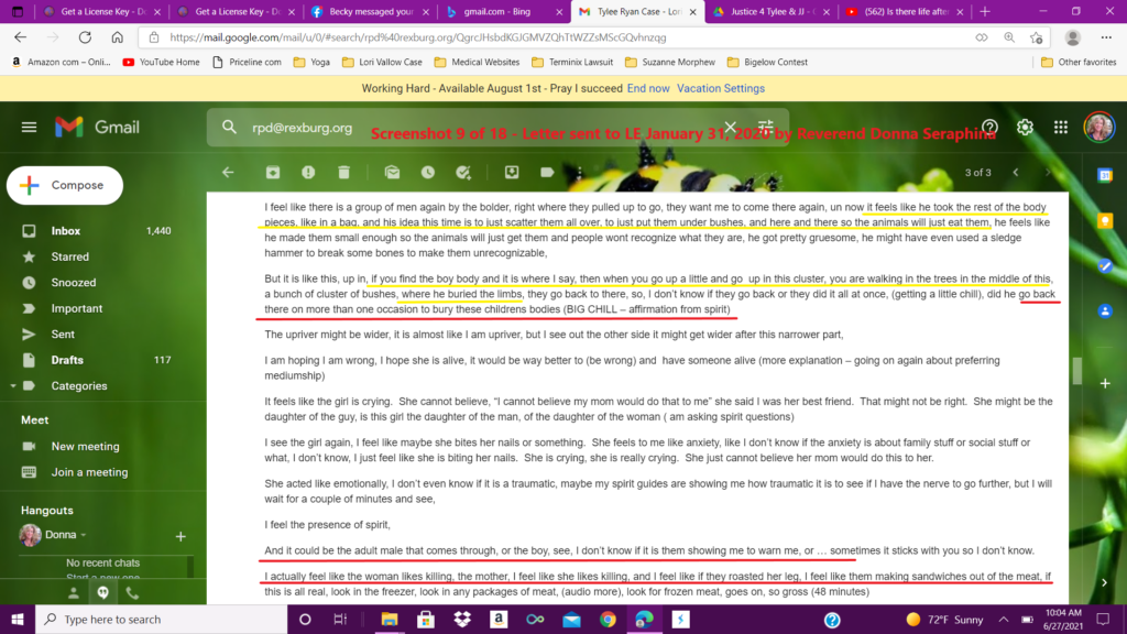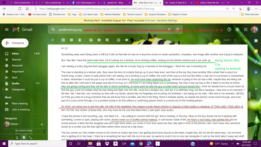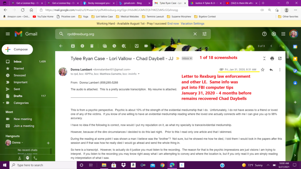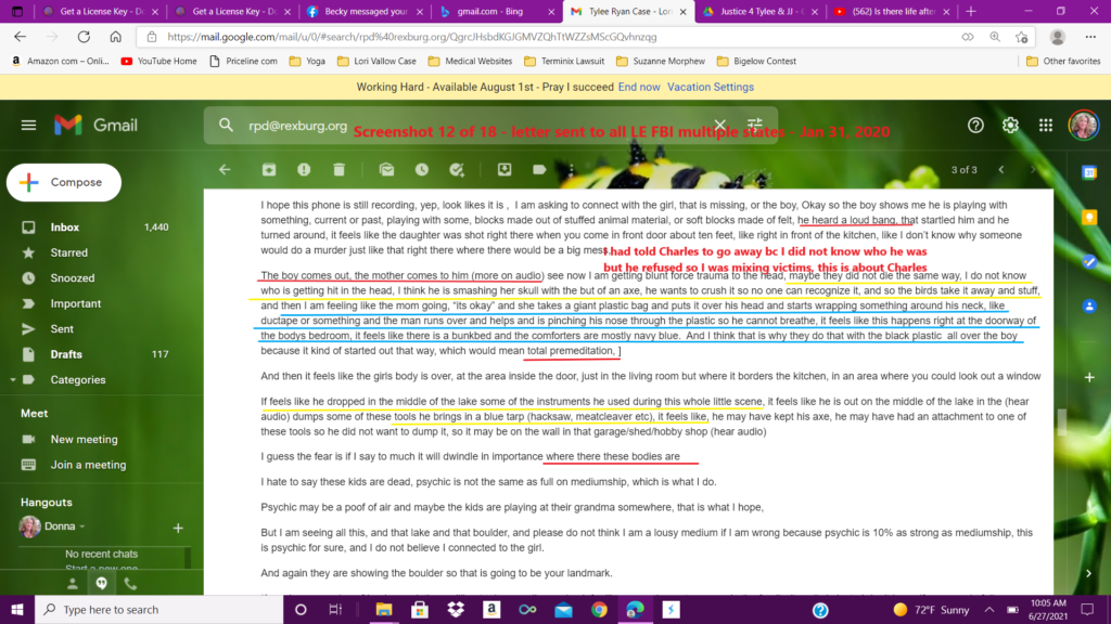 This ten page email was sent to multiple law enforcement agencies in five states, including Idaho, Arizona, and Hawaii, as well as the FBI, the governor’s office of Idaho, the Idaho state attorney generals office and many more. The link given in this email will be uploaded to the psychic reading uploaded to YouTube on January 20, 2020.