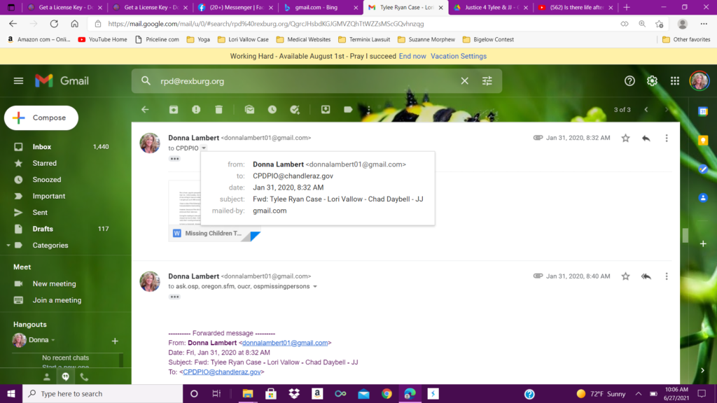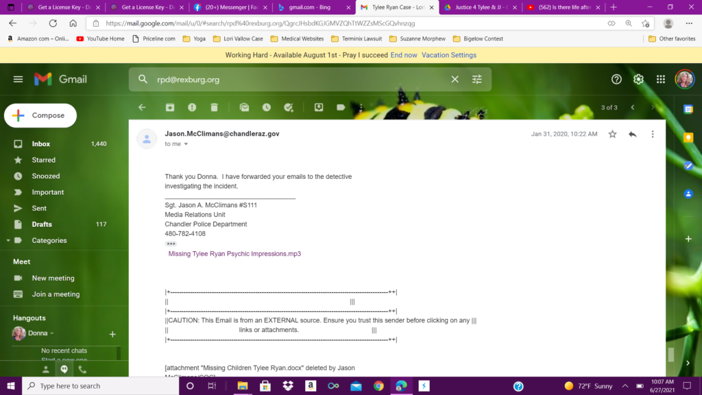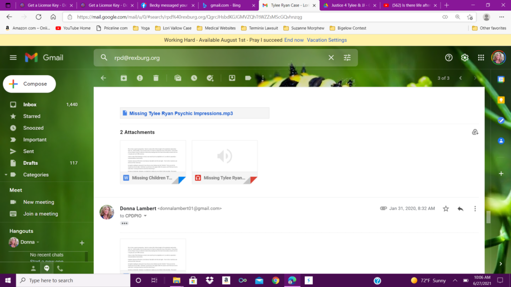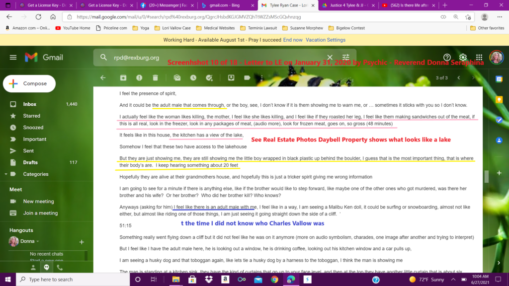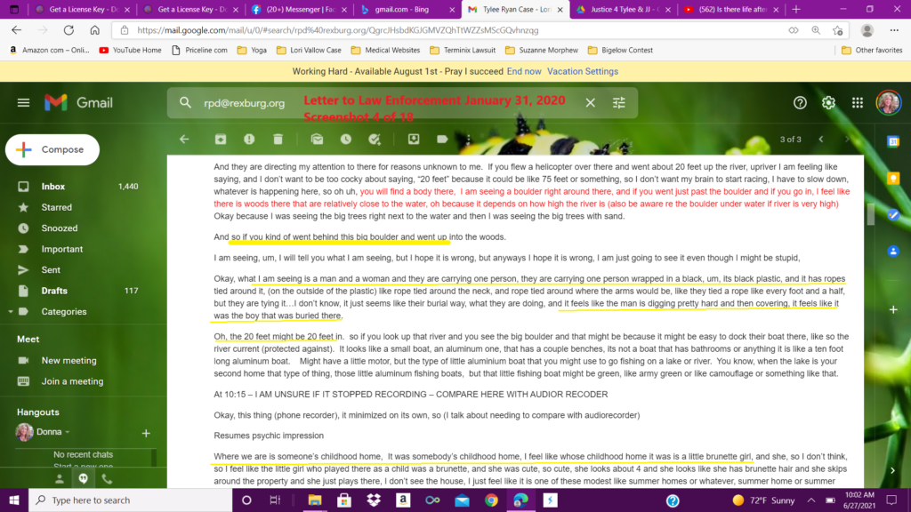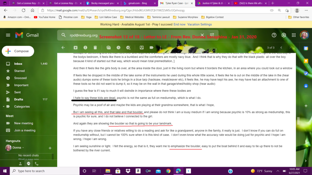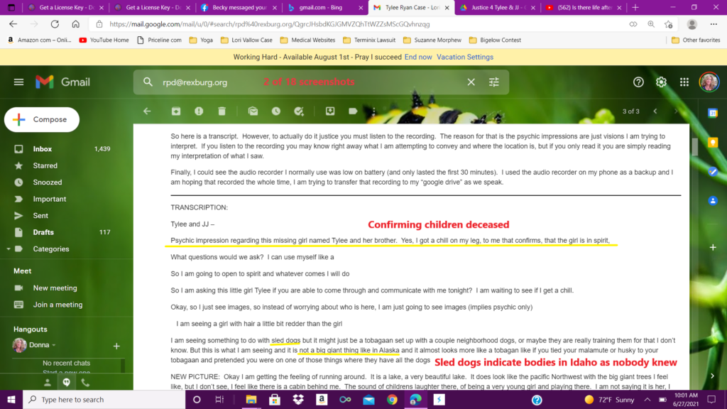 I uploaded this first reading, as well as sent the emails on January 31, of 2020, and then sent an email to Kay Woodcock, the biological grandmother of JJ Vallow, and the sister of Charles Vallow. Kay Woodcock was running the “find Tylee and JJ” email. She did respond and that will be published in a later article. You can search this website as well to find other articles.