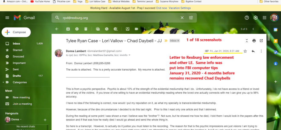 This ten page email was sent to multiple law enforcement agencies in five states, including Idaho, Arizona, and Hawaii, as well as the FBI, the governor’s office of Idaho, the Idaho state attorney generals office and many more. The link given in this email will be uploaded to the psychic reading uploaded to YouTube on January 20, 2020.